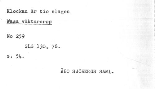 //// < //// * //// Klockan är tio slagen ^ //// t //// Wasa väktarerop ! //// t= //// ? //// ! //// i //// No 259 ! //// ! //// SLS 130, 76. ! //// s. 54. ; //// . //// * * , ////