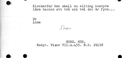 //// Klockarfar han skall nu allting bestyra //// lära barnen att två och två det är fyra... //// Dr //// Lima //// NORD. MUS. //// Mskpt. Visor VII.s.455. E.U. 29158 ////