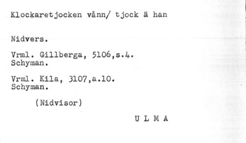 //// Klockaretjocken vånn/ tjock ä han ; //// I //// * //// Nidvers. //// I //// . t //// Vrml. Gillberga, $106,s.4. //// S chyman. //// Vrml. Kila, 3107,a.10. //// Schyman. //// (Nidvisor) //// U L M A ////