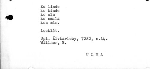 //// ! Ko linde //// ko kinde //// ^^ ko al a //// ^^ ko smala //// koa min. //// Locklåt. //// Upl. Älvkarleby, 7262, s.44. //// Willner, E. //// U L M A //// ^ . . ^ ^ ////