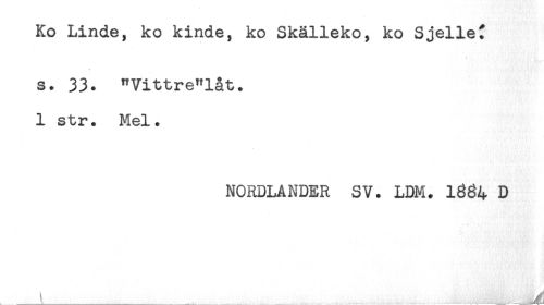 //// Ko Linde, ko kinde, ko Skälleko, ko Sjellet //// s. 33. "Vittre"låt. //// 1 str. Mel. //// NORDLANDER SV. LDM. 1684 D //// , _.____________ ............ . _______ ////