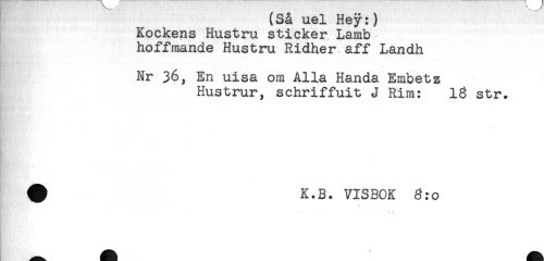//// (Sa uel Hey:) //// Kockens Hustru sticker Lamb //// hoffmande Hustru Ridher aff Landh //// M^ii**' * " -'...... ...................... .' < . , . . i,-,!- ... //// Nr 36, En uisa om Alla Handa Embetz //// Hustrur, schriffuit J Rim: 18 str. //// # K.B. VISBOK 8:0 ////