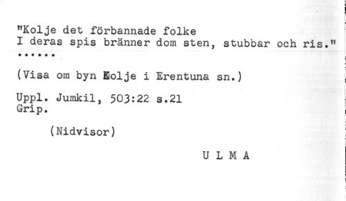 //// f //// 1= //// "Kolje det förbannade folke f //// I deras spis bränner dom sten, stubbar och ris." //// ^ = //// (Visa om byn Eolje i Erentuna sn.) i //// F //// i //// < ' i //// Uppl. Jumkil, 503:22 s.21 //// Grip. //// L //// L //// (Nidvisor) //// U L M A //// ) ////