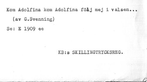 //// Kom Adolfina kom Adolfina föåj mej i valsen... //// (av G.Svenning) //// Se: E 1909 ee //// KB:s SKILLINGTRYCKSREG. //// ! //// -_______________ ________,_.__.._________*_______------- - --------. ^ ____ ////