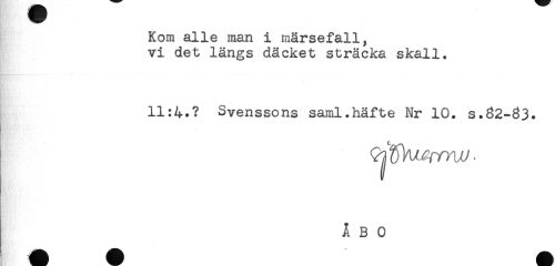 //// Kom alle man i märsefall, //// vi det längs däcket sträcka skall. //// 11:4.? Svenssons saml.häfte Nr 10. s.62-63. //// - ////