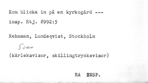 //// Kom blicka in på en kyrkogård -- //// insp. Rtj. 3992:5 //// Rehnman, Lundeqvist, Stockholm //// (kärleksvisor, skillingtrycksvisor) //// RA HNSP. ////