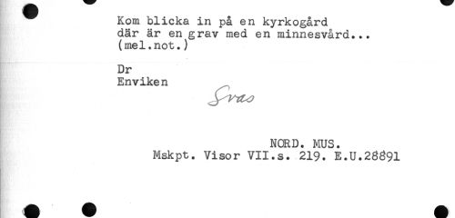 //// Kom blicka in på en kyrkogård //// där är en grav med en minnesvård... //// (mel.not.) //// Dr //// Enviken //// NORD. MUS. //// Mskpt. Visor VII.s. 219. E.U.28391 ////