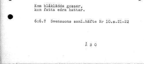 //// Kom blåklädda gossar, //// kom fatta edra hattar. //// 6:6.? Svenssons saml.häfte Nr 10.s.21-22 //// < //// Kf //// HR. //// F' å' //// ipi //// ! //// < //// ! //// ' //// 7- //// TU* //// { //// ABO //// - //// i //// Hy"' - //// K //// i ////