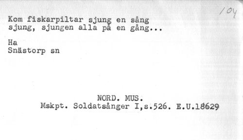 //// Kom fiskarpiltar sjung en sång //// sjung, sjungen alla på en gång... //// Ha //// Snästorp sn //// NORD. MUS. //// Mskpt. Soldatsånger I,s.526. E.U.18629 ////