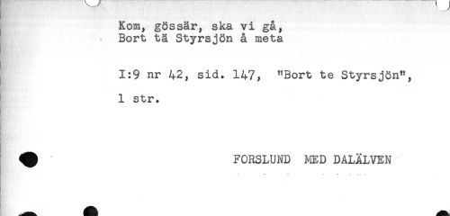 //// Kom, gössär, ska vi gå, //// } - Bort tä Styrsjön å meta //// 1:9 nr 42, sid. 147, "Bort te Styrsjön", //// 1 str. //// ^ FORSLUND MED DALÄLVEN ////