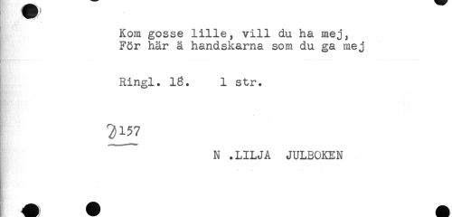//// Kom gosse lille, vill du ha mej, //// För här ä handskarna som du ga mej //// HR'' .......* - .......-...... ...............- .............. //// Ringl. 13. 1 str. //// N .LILJA JULBOKEN ////