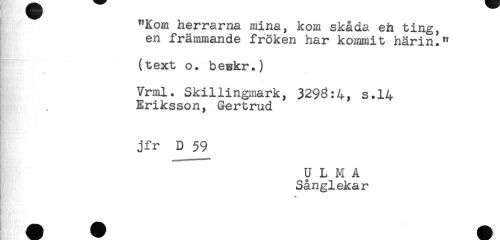 //// "Kom herrarna mina, kom skåda eh ting, //// en främmande fröken har kommit härin." //// (text o. bewkr.) //// * //// Vrml. Skillingmark, 3293:4, s.14 //// Eriksson, Gertrud //// jfr D 59 //// U L M A //// Sånglekar //// < ////