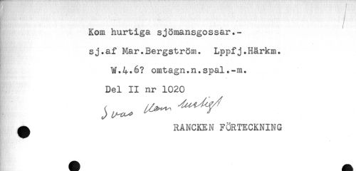 //// ^ - ; //// Kom hurtiga sjömansgossar.- //// sj.af Mar.Bergström. Lppfj.Härkm. //// W.4.6? omtagn.n.spal.-m. //// ... //// Del II nr 1020 //// ^ RANCKEN FÖRTECKNING ////
