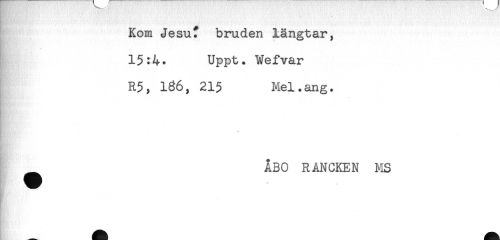 //// Kom Jesu? bruden längtar, //// 15:4. Uppt. Wefvar //// R5, 186, 215 Mel.ang. //// ** //// ABO RANCKEN MS ////