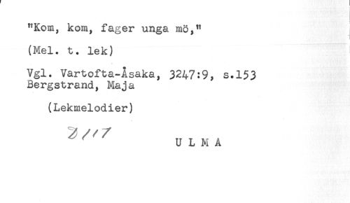 //// < //// < //// "Kom, kom, fager unga mö," //// (Mel. t. lek) //// Vgl. Vartofta-Åsaka, 3247:9, s.153 //// Bergstrand, Maja //// (Lekmelodier) ////