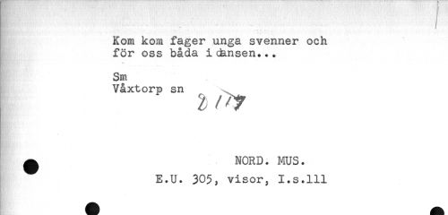 //// . - . - . //// , . . . //// ! ' //// Kom kom fager unga svenner och //// för oss båda icänsen... //// Ki.'..- . //// ....... - - //// Sm //// Våxtorp sn //// K' //// ^ NORD. MUS. //// E.U. 305, visor, I.s.lll ////