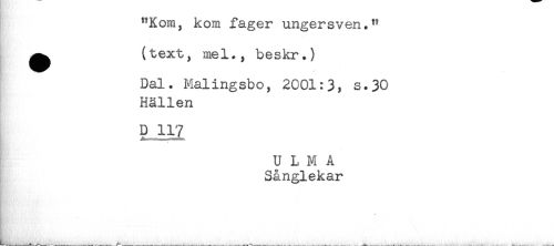 //// "Kom, kom fager ungersven." //// . //// ^ (text, mel., beskr.) //// Hy //// Dal. Malingsbo, 2001:3, s.30 //// Hällen //// 5 II? //// U L M A //// Sånglekar ////