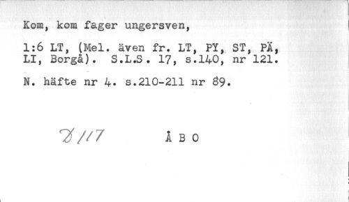 //// Kom, kom fager ungersven, //// 1:6 LT, (Mel. även fr. LT, PY, ST, PÄ, //// LI, Borgå). S.L.S. 17, s.140, nr 121. //// ! //// . . ** : //// N. häfte nr 4. s.210-211 nr 39. //// ÅBO //// ) ////