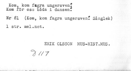 //// Kom, kom fagra ungersven. //// Kom för oss båda 1 dansenf //// Nr (Kom, kom fagra ungersven? Sånglek) //// 1 str. mel.not. //// ERIK OLSSON MUS-HIST.MUS. ////
