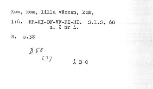 //// Kom, kom, lilla vännen, kom, //// 1:6. KR-KI-DF-VF-FB-HI. S.L.S. 60 //// s. 2 nr 4* //// N. s.33 //// ^^ A B 0 ////