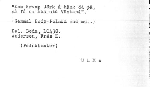 //// "Kom Kramp Järk å hånk dä på, //// så få du åka utå Västanå". //// (Gammal Boda-Polska med mel.) ^ //// Dal. Boda, 10433. , //// Anderson, Fräs E. //// (Polsktexter) t //// t //// ; //// U L M A ////