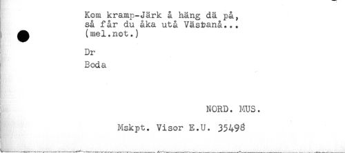 //// Kom kramp-Järk å häng dä på, //// så får du åka utå Väsbanå... //// ^ (mel.not.) //// Dr //// Boda //// NORD. MUS. //// Wgyt'., //// Mskpt. Visor E.U. 35493 ////