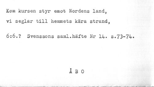 //// Kom kursen styr emot Nordens land, //// vi seglar till hemmets kära strand, //// 6:6.? Svenssons saml.hafte Nr 14* s.73-74* ////