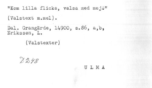 //// "Kom lilla flicka, valsa med mej3" //// (Valstext m.mel). //// Dal. Grangärde, 14900, s.36, a,b, //// Eriksson, L. //// (Valstexter) //// U L M A ////