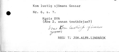 //// Kom lustig sjömans Gossar //// ^ Nr. 6, s. 7. //// Kopia SVA //// (Abo 2, annan textbörjan?) //// ! j ^ ^^ //// REGr T^ JOH.ALFR.LINDBÄCK //// ^ i; H //// - ......... , ^ ^ _^ ' ////