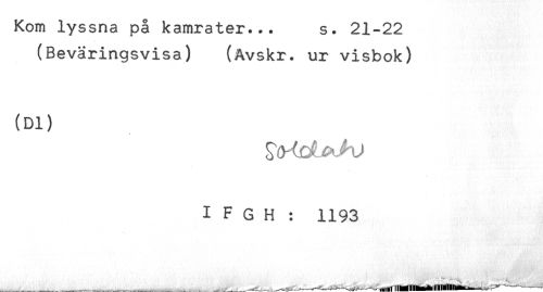 //// Kom lyssna på kamrater... s. 21-22 //// (Beväringsvisa) (Avskr. ur visbok) //// (Dl) //// IFGH: 1193 ////