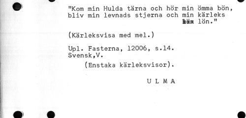 //// W "Kom min Hulda tama och hor mm omma bon, //// bliv min levnads stjema och min kärleks //// &HH lön." //// (Kärleksvisa med mel.) //// t - //// Upl. Fas tema, 12006, s.14. //// Svensk,V. //// (Enstaka kärleksvisor). //// U L M A //// t ^ ^ ////