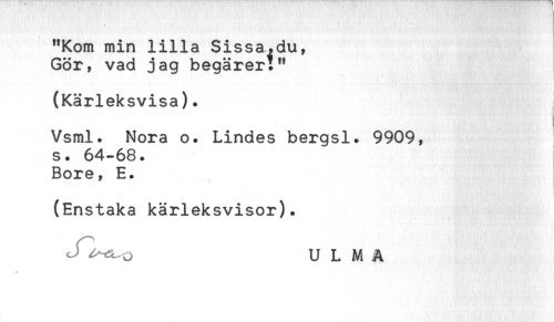 //// "Kom min lilla Sissa.du, //// Gör, vad jag begärert" //// (Kärleksvisa). //// Vsml. Nora o. Lindes bergsl. 9909, ! //// s. 64-68. I //// Bore, E. //// (Enstaka kärleksvisor). //// U L M A ////