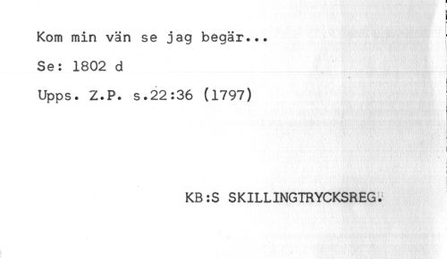 //// j //// E //// . //// Kom min vän se jag begär... //// Se: 1802 d //// ! //// t //// f //// Upps. Z.P. s.22:36 (1797) //// t //// : //// i //// i- //// ! //// KB:S SKILLINGTRYCKSREG. ////