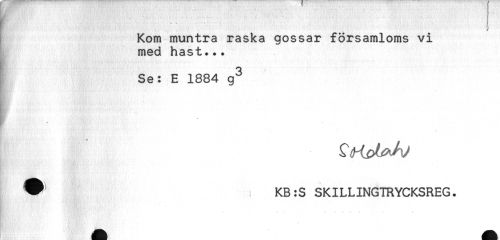 //// f- ! //// Kom muntra raska gossar församloms vi //// med hast... //// 3 //// Se: E 1884 g^ //// - //// * //// ^ KB:S SKILLINGTRYCKSREG. //// « .. - . " -* - s y ////