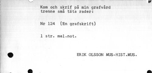 //// Kom och skrif på min grafvård //// trenne små täta rader: //// Nr 124 (En grafskrift) //// 1 str. mel.not. //// t //// ^ ERIK OLSSON MUS-HIST.MUS. ////