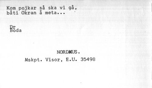 //// Kom pojkar så ska vi gå, //// båti Okran å meta... //// < //// Eoda //// NORDMUS. //// Mskpt. Visor, E.U. 35498 //// j ////