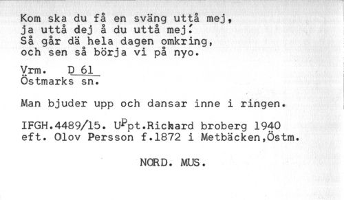 //// Kom ska du få en sväng uttå mej, //// ja uttå dej å du uttå mej^ //// Så går dä hela dagen omkring, //// och sen så börja vi på nyo. //// -- -- - < //// Vrm. D 61 //// Östmarks sn. //// * //// Man bjuder upp och dansar inne i ringen. //// IPGH.4489/15. U^pt.Richard broberg 1940 //// eft. Olov Persson f.1872 i Metbäcken,Östm. //// NORD. MUS. ////