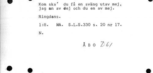 //// jKom sxa au ia en svang u^av mej , //// jag an av dej och du en av mej. //// Ringdans. //// 1:8. MA. S.L.S.330 s. 20 nr 17. //// N. //// ÅBO ? ////