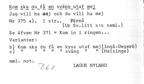 //// Kom ska du_få en sväng_utaf mej^ //// Jag vill ha déj och du vill ha mej //// Nr 375 a), 1 str,, Pärnå //// (Ur Sv.litt s:s saml.) //// ! //// Se äfven Nr 371 = Kom in i ringen... //// Varianter: I //// b) Kom ska du få en kyss utaf mej(lngå-Degerö) //// c) " " " " " sväng ^ " (Helsinge) j //// i //// mel. not. //// LAGUS NYLAND ////