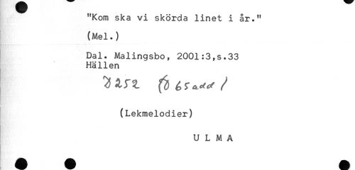 //// "Kom ska vi skörda linet i år." //// (Mel.) //// Dal. Malingsbo, 2001:3,s.33 //// Hällen //// (Lekmelodier) //// ? * ////
