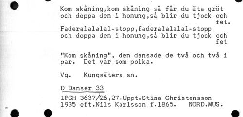 //// ^ Kom skåning,kom skåning sa far du äta gröt //// och doppa den i honung,så blir du tjock och //// fet. //// Faderalalalal-stopp,faderalalalal-stopp //// och doppa den i honung,så blir du tjock och //// fet //// "Kom skåning", den dansade de två och två i //// par. Det var som polka. //// Vg. Kungsäters sn. //// D Danser 33 //// IFGH 3637/26,27.Uppt.Stina Christensson //// 1935 eft.Nils Karlsson f.1865. NORD.MUS. ////