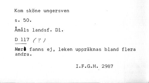 //// Kom sköne ungersven //// s. 50. //// Åmåls landsf. Dl. //// D 117 ^ ^ / //// Mert fanns ej, leken uppräknas bland flera //// andra. //// I.F.G.H. 2987 //// * ////
