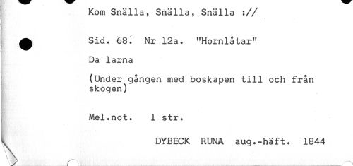 //// t Kom Snalla, Snälla, Snälla :// //// ^ Sid. 68. Nr 12a. "Hornlåtar" //// Da lama //// (Under gången med boskapen till och från //// skogen) //// Mel.not. 1 str. //// ^ DYBECK RUNA aug.-häft. 1844 ////