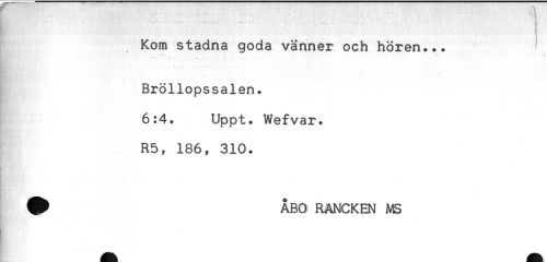 //// Kom stadna goda vänner och hören... //// Bröllopssalen. //// 6:4. Uppt. Wefvar. //// R5, 186, 310. //// * //// ^ ÅBO RANCKEN MS //// * ////