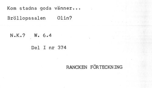 //// Kom stadna goda vänner... //// Bröllopssalen 01in? //// N.K.? W. 6.4 //// Del I nr 374 //// RANCKEN FÖRTECKNING ////