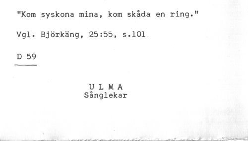 //// "Kom syskona mina, kom skåda en ring." //// Vgl. Björkäng, 25:55, s.101 //// D 59 //// ULMA //// Sånglekar //// L ^ , ^ __ , - ' __ ^ ___ //// t _____ _____ ___--------------.--.-------___-------- - . --' ------------* ^ ////