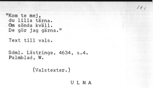 //// "f ' - - ' - //// - . . , //// "Kom te mej, //// du lilla tärna. //// Om sönda kväll. //// De gör jag gärna." //// Text till vals. //// Sdml. Lästringe, 4634, s.4. //// Palmblad, W. //// (Valstexter.) //// U L M A ////