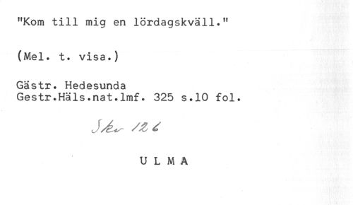 //// "Kom till mig en lördagskväll." //// (Mel. t. visa.) //// Gästr. Hedesunda //// Gestr.Häls.nat.lmf. 325 s.10 fol. ////