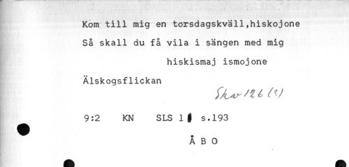 //// -. ^ ^ ... .- - " . - //// - * *** ... . - //// Kom till mig en torsdagskväll,hiskojone //// Så skall du få vila i sängen med mig //// ... //// hiskismaj ismojone //// Älskogsflickan //// 9:2 KN SLS H s.193 ////