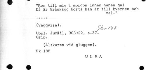 //// "Kom till mig i morgon innan hanen gal //// Då är Gråskägg borta han är till kvarnen och //// mal." //// (Vaggvisa). //// Uppl. JumHl, 303:22, s.37. //// Grip. //// (Älskaren vid gluggen). //// Sk 188 ////